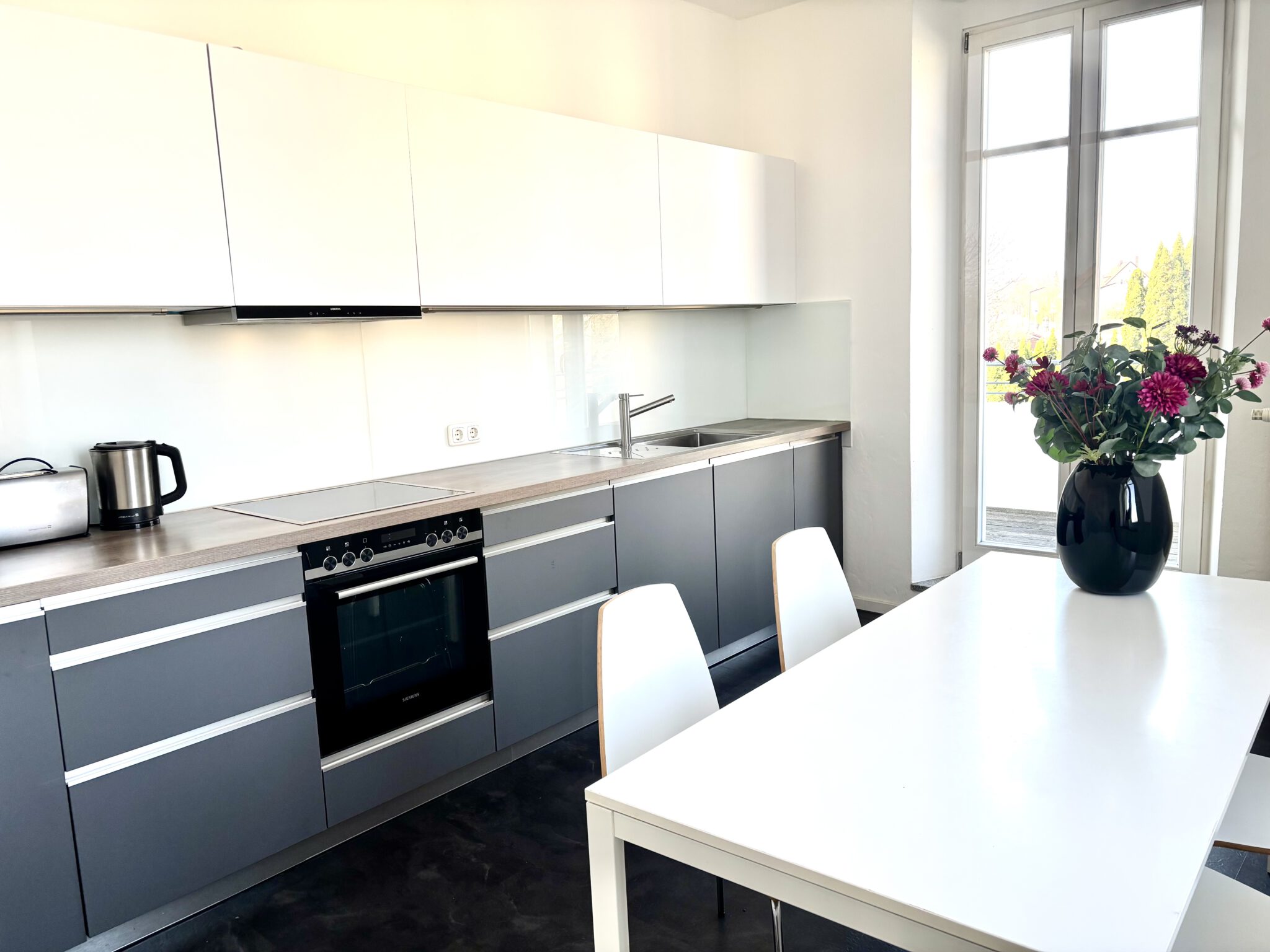 Einbauküche mit Kühlschrank, Ceran-Kochfeld, Backofen, Geschirrspüler, Kaffeemaschine, Mikrowelle, Wasserkocher, Toaster